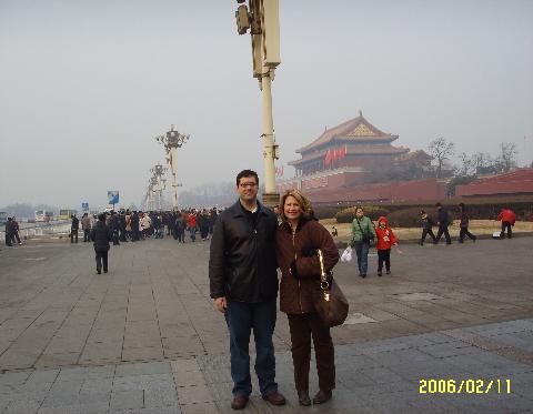 Diane and Pete near Tiananmen Square and the Forbidden City (Forbidden City seen in the background).